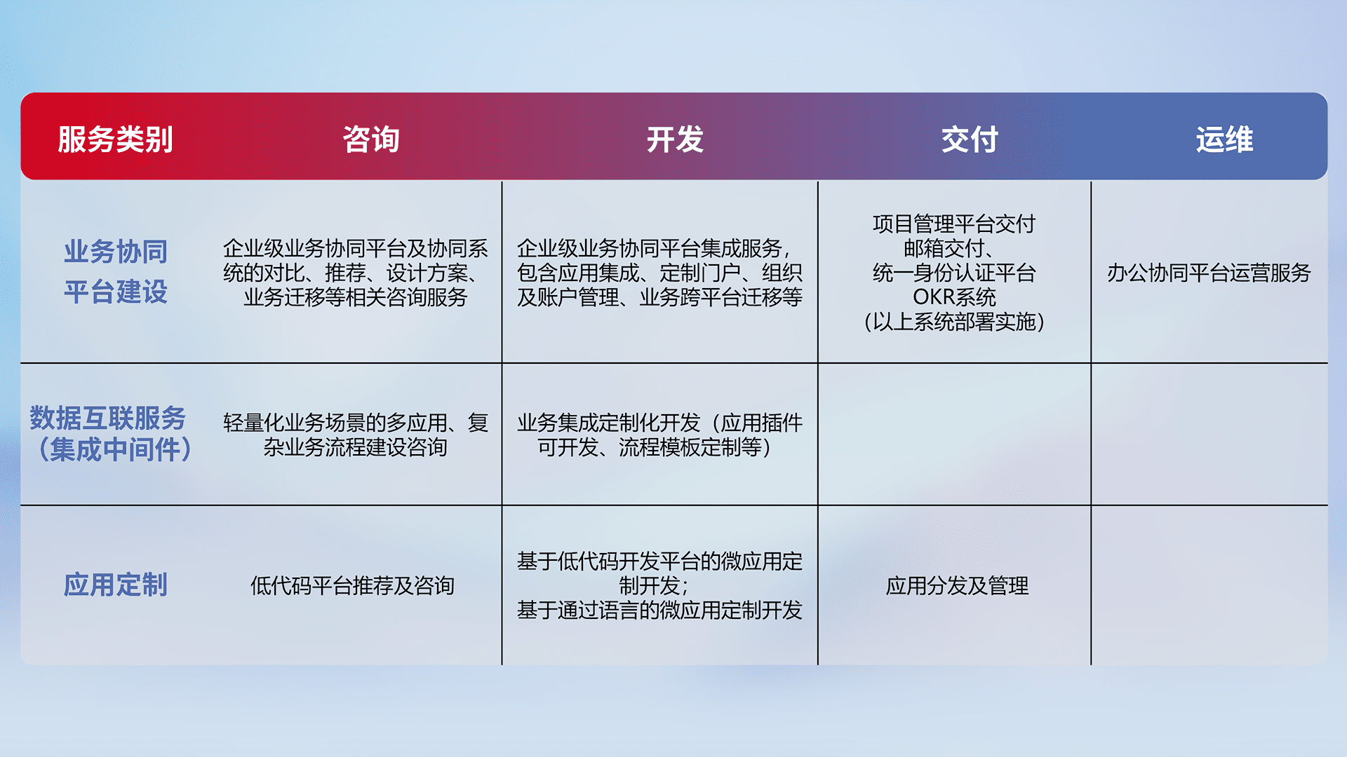 针对钉钉、、、、企微、、、IDaas等平台级产品提供产品的规划、、方案、、、交付、、、定制化开发等服务,,,,实现如统一协同办公、、智能客户服务、、、混合会议管理、、智能数据查询、、等业务场景,,,实现数字化转型。。