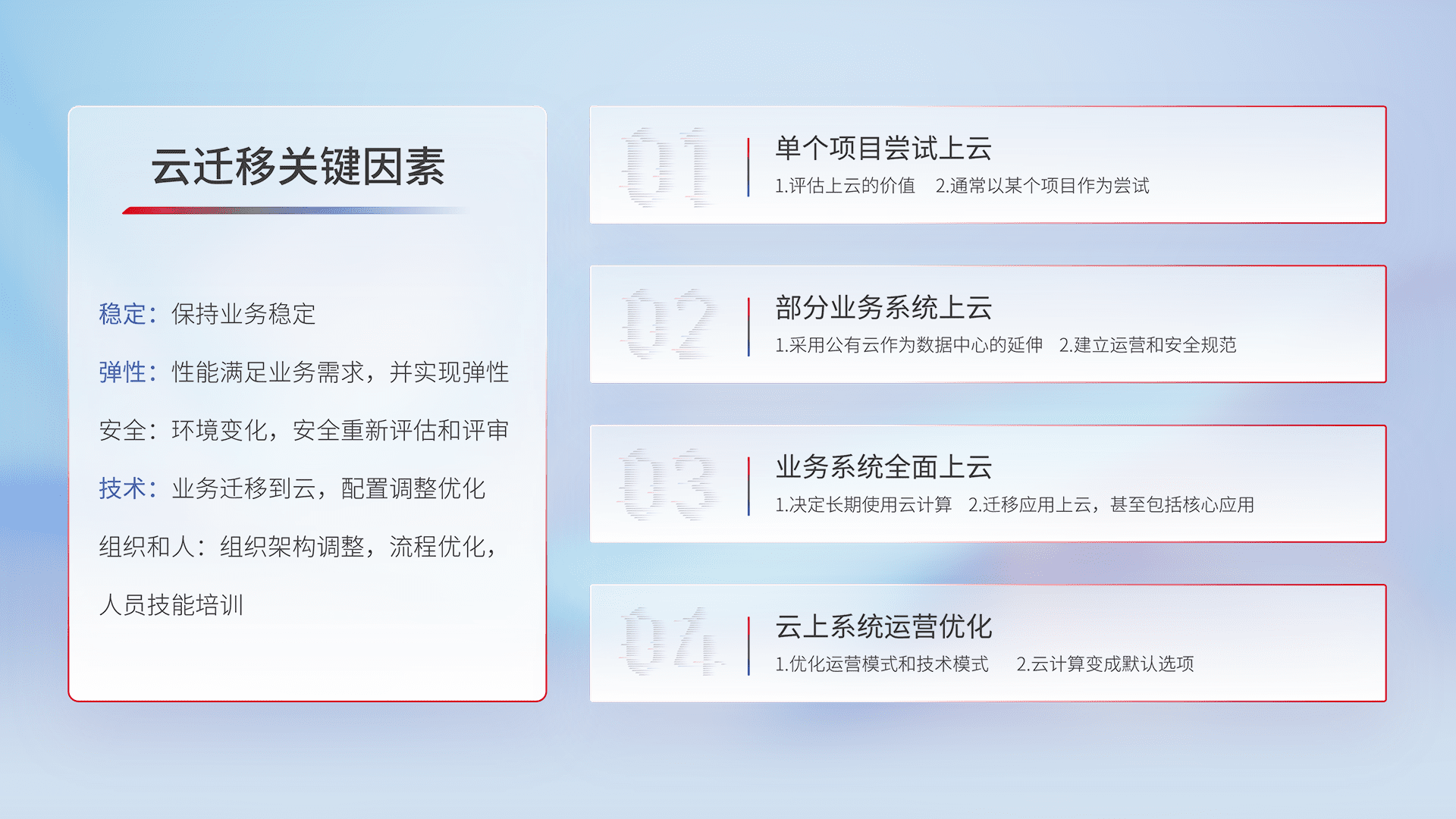 结合实际业务,,,从规划设计、、、、云平台选型、、云原生改造、、、数据迁移、、、、集成交付,,,,迁移全过程为客户识别最佳上云路径,,做好风险识别管理,,设计网络架构、、身份权限、、、、安全审计合规、、、操作审计、、、日志审计、、、监控告警策略、、、多站点容灾设计等,,对云上基础设施进行整体规划,,,提升IT治理水平,,以满足弹性、、高可用、、、、高性能的需求。。。。