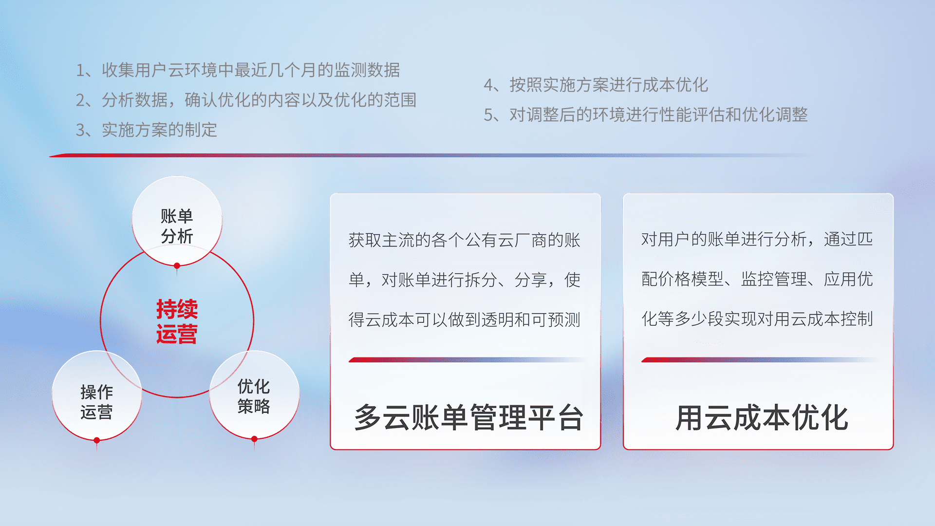 通过多云纳管,,,以统一的资源数据模型把客户的云资源进行抽象和封装,,,,进而实现对多云资源的统一操作,,,,保障云资源管理的可靠性、、、、稳定性与可用性。。。。量身定制化运维内容,,,,配置、、开发运维、、、补丁管理、、、、备份、、、监控、、、、认证和访问管理、、审计和日常巡检等,,,保障在用云过程中的可靠度,,,,稳定度以及高可用率。。。。